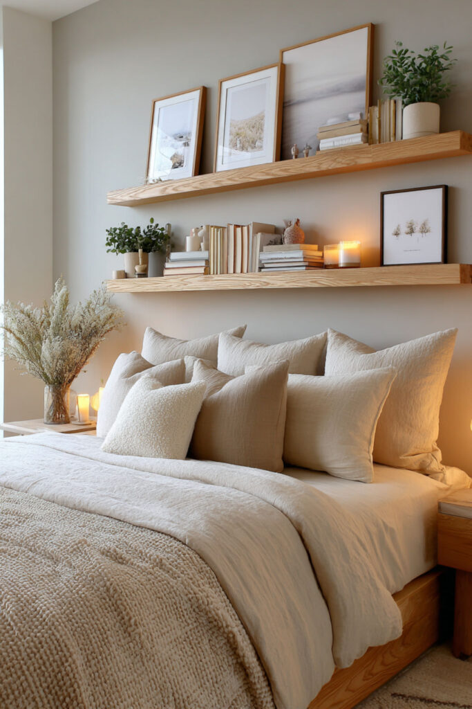 Storage doesn’t have to be boring, and floating shelves prove that point perfectly. These aren’t just for books—though definitely include some aesthetically pleasing books because they photograph beautifully. I’m talking about displaying your favorite skincare products, small plants, candles, vintage cameras, or whatever collection you’re currently obsessing over.