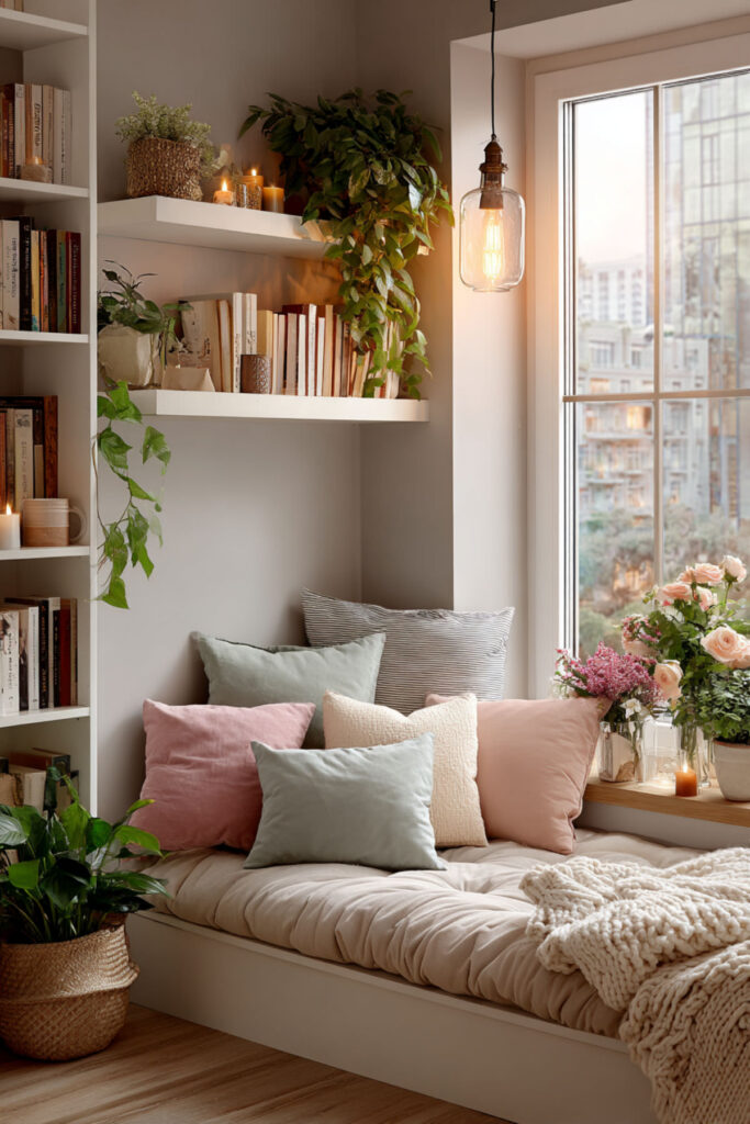 Not everyone has space for a separate reading area, but that doesn’t mean you can’t create a cozy spot for diving into books (or scrolling through your phone, no judgment). Sometimes the best reading nooks are in unexpected places—a wide windowsill with some cushions, a corner with floor pillows, or even just making your bed extra comfortable for daytime lounging.