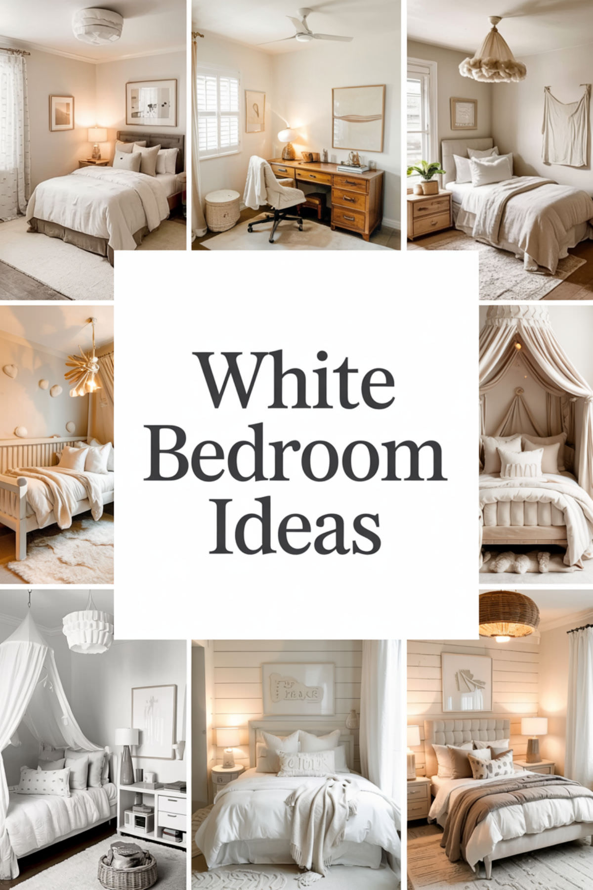 Create a white wall bedroom with strategic color pops that guide focus without overwhelming. You can keep walls warm white but add single-color accents – navy desk chair, forest green reading lamp, golden picture frames. These purposeful pops create visual anchors for different activities.