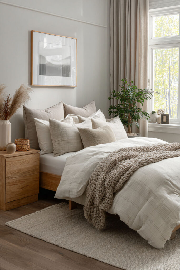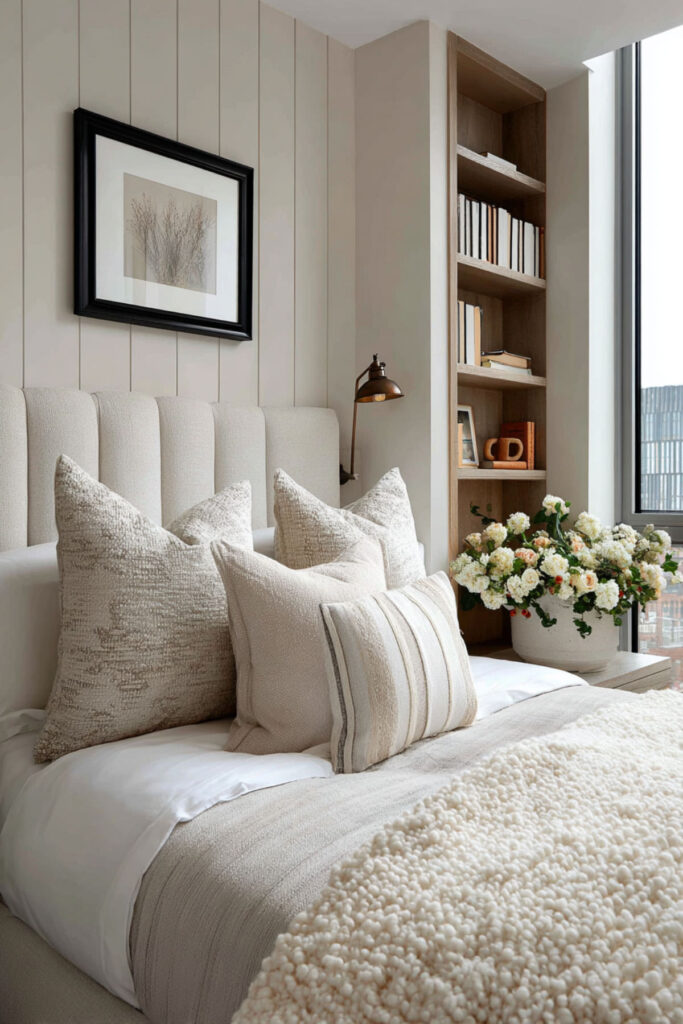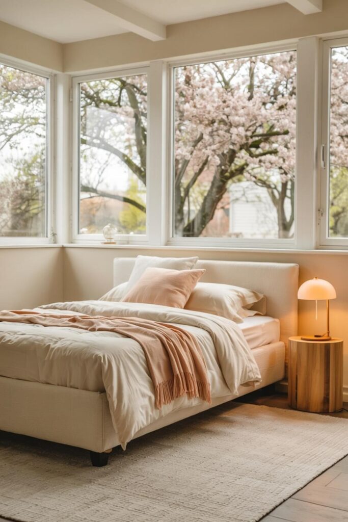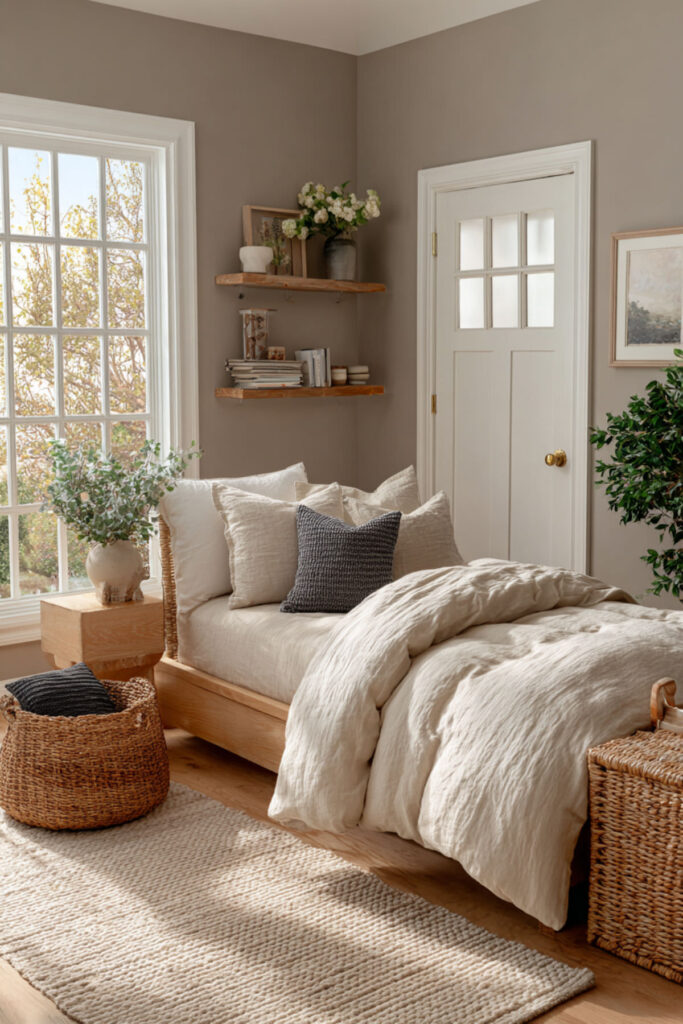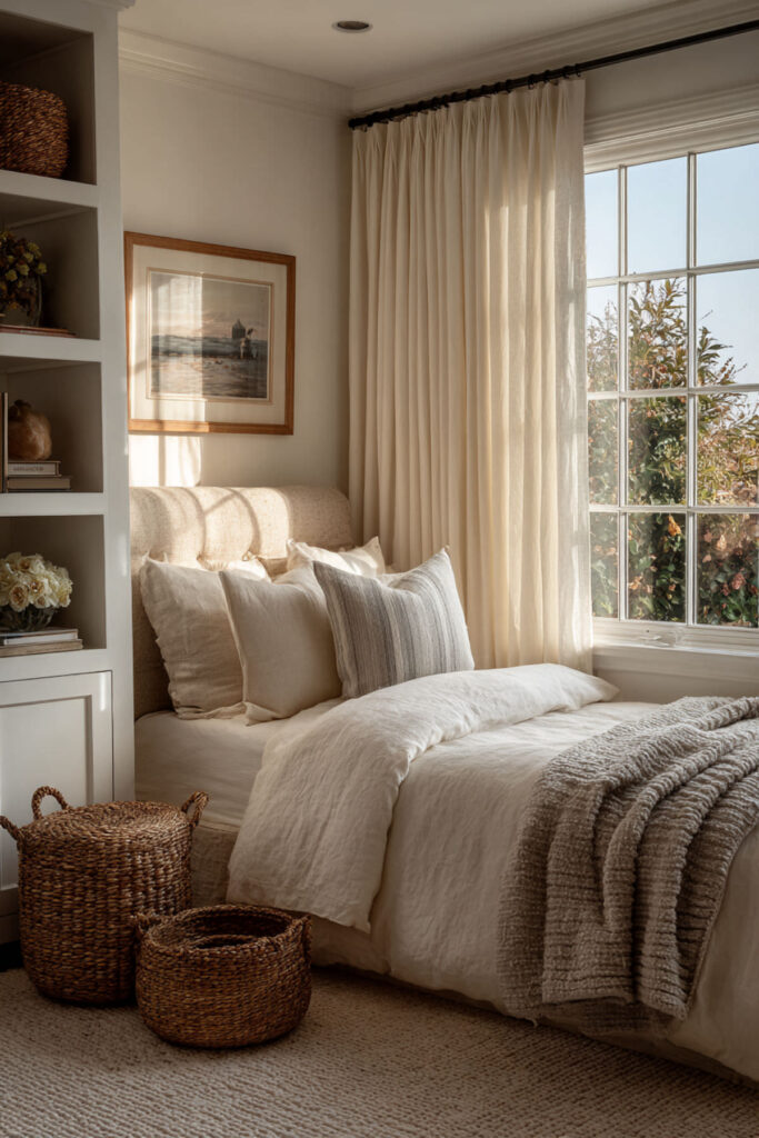 Incorporate white and beige bedroom ideas for warmth without distraction. Consider painting walls warm white and adding beige rugs, curtains, and upholstery. This combination prevents sterility while maintaining focus-supporting simplicity.