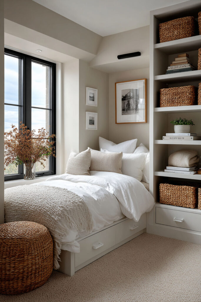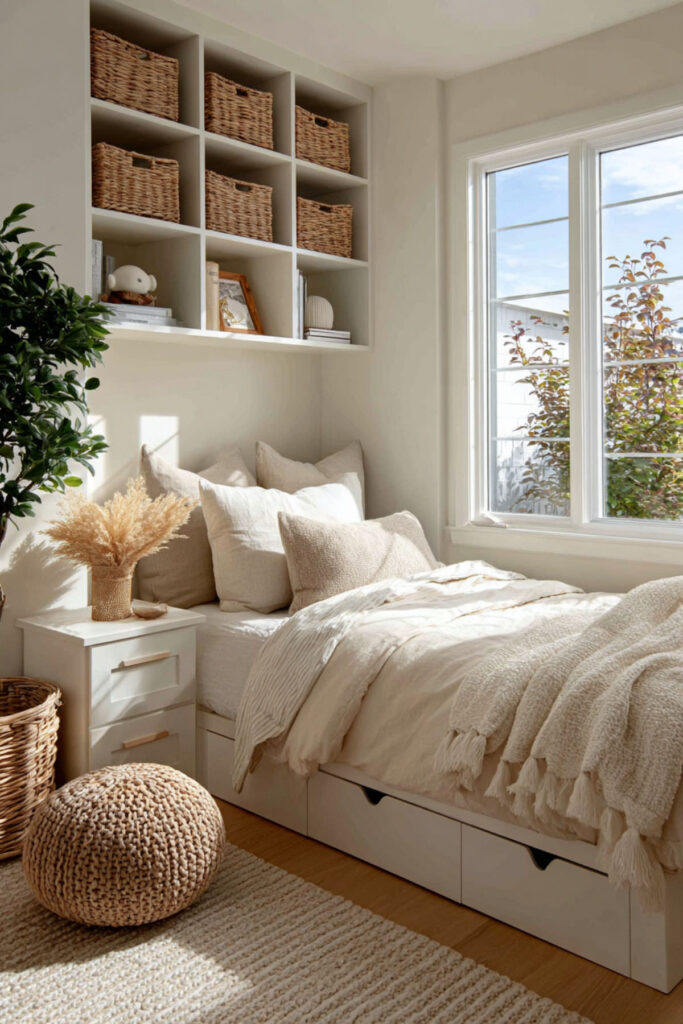 Implement white bedroom design with visible organized systems that build executive function. Install white shelving units, labeled white bins, and clear containers against white walls. The monochromatic organization reduces visual clutter while keeping everything accessible.