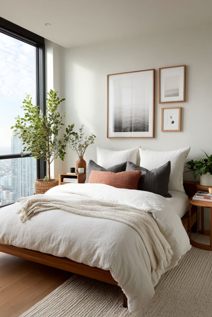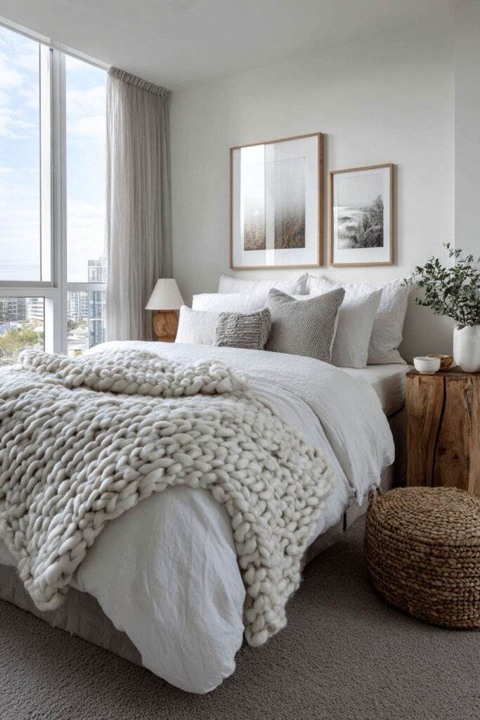 Design a white Scandinavian bedroom incorporating hygge elements for cozy focus. Consider combining warm white walls with natural wood accents, soft white textiles, and minimal decoration. This style naturally supports concentration through intentional simplicity. Scandinavian white feels lived-in rather than sterile.