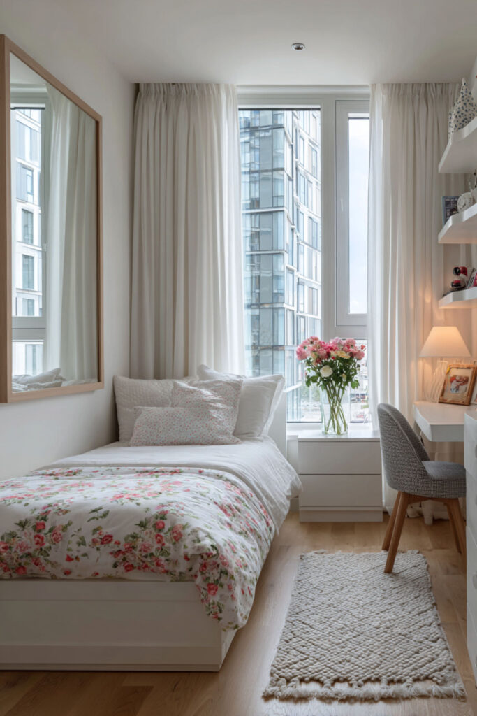 Develop small white bedroom ideas that maximize space for movement and focus. Consider using warm white on all surfaces to visually expand the room, wall-mounted white furniture, and multi-functional white storage. White makes small spaces feel larger and less constraining.