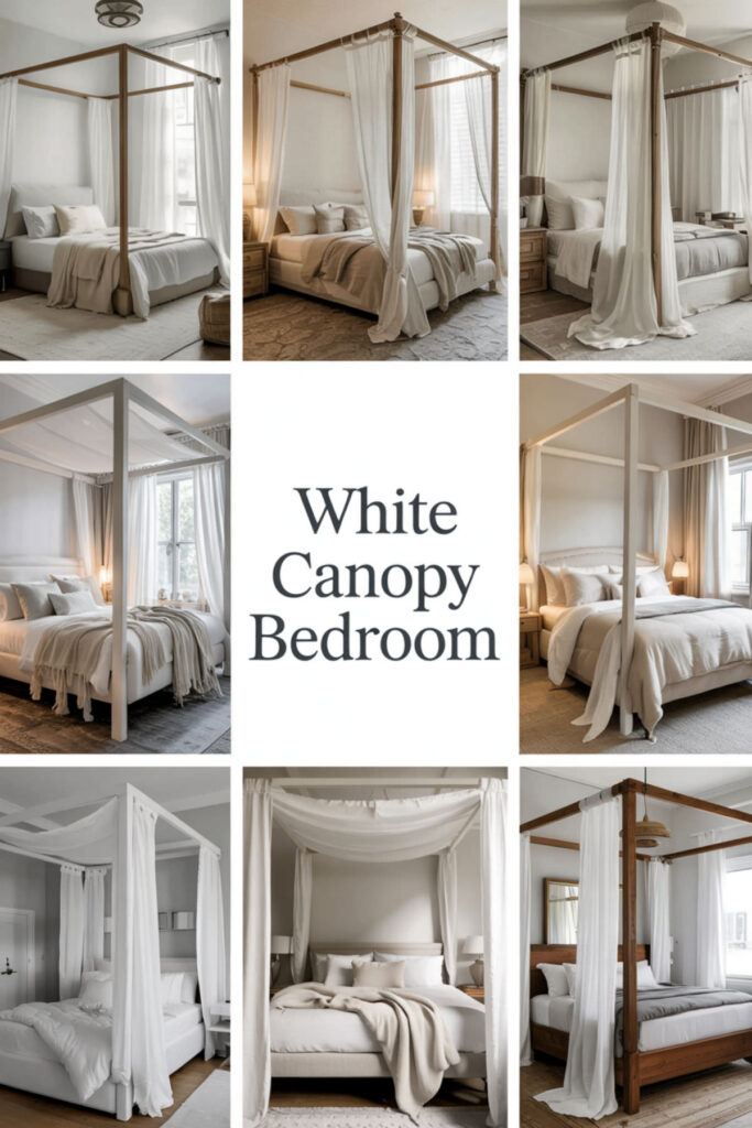Install white canopy bedroom ideas creating a focused sanctuary within the room. Hang sheer white curtains from ceiling-mounted rods, defining the bed area as a calm zone. The canopy provides gentle boundary without isolation.